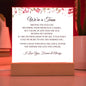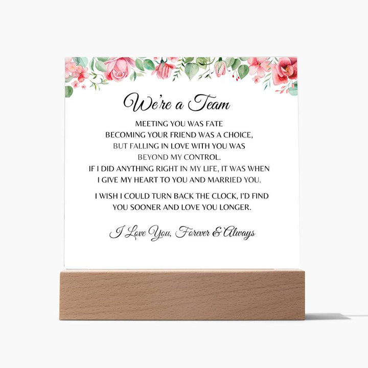 Combine modern technology and a heartfelt message with our 'We're a Team' Square Acrylic Plaque! This design is printed on crystal-clear premium acrylic and easily becomes the centerpiece of any room. And the contemporary design wouldn't be complete without its sleek wooden base, elevating the display that will instantly become a conversation starter. Create a memorable presentation when you upgrade to the LED wooden base! This is the perfect Valentine's Day gift for your beloved partner. Express your love by getting it today and letting them know how much they mean to you!"